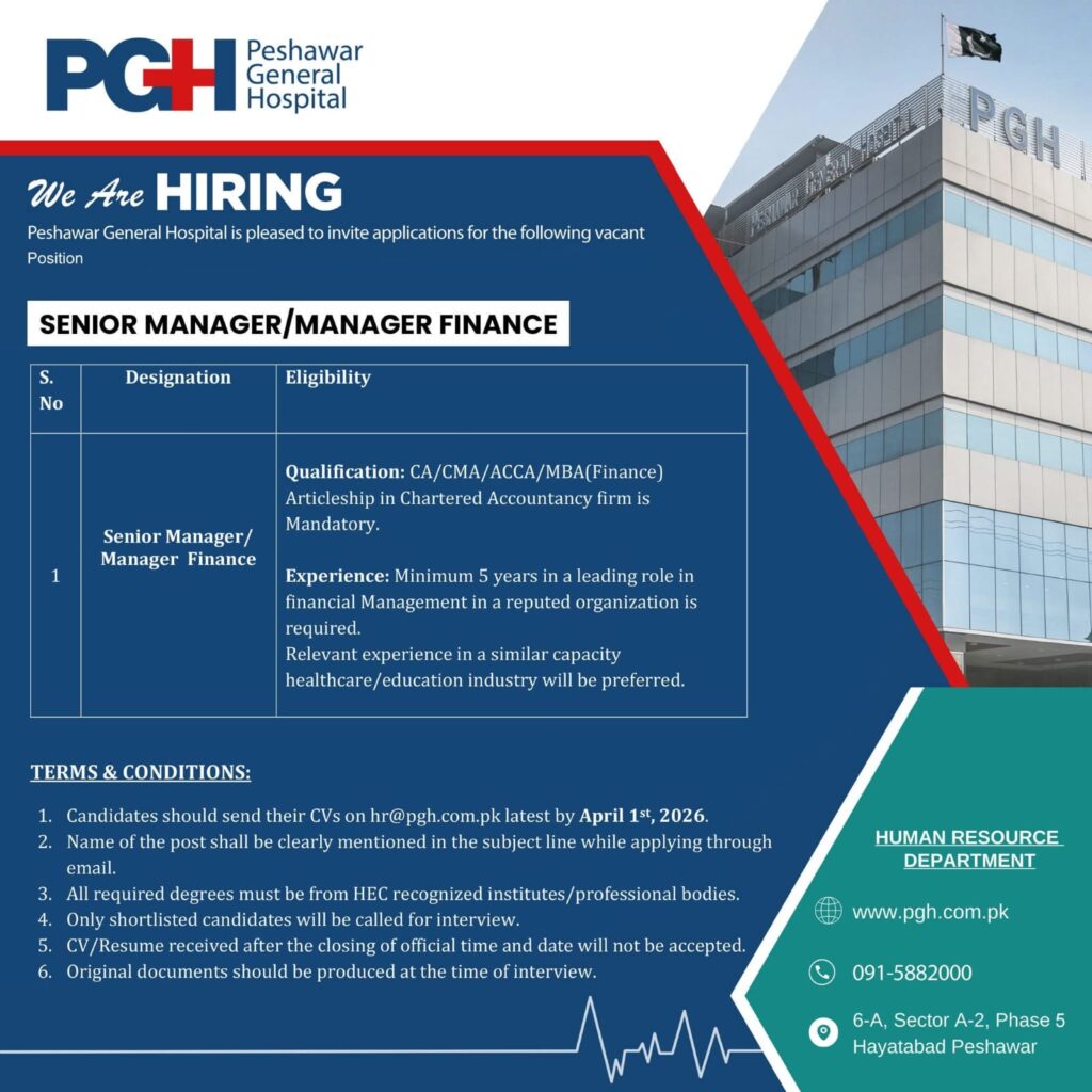 Apply for the Senior Manager/Manager Finance job at Peshawar General Hospital (PGH). 2026 vacancy for CA, ACCA, and MBA Finance professionals with 5 years of experience. Submit your CV by April 1.