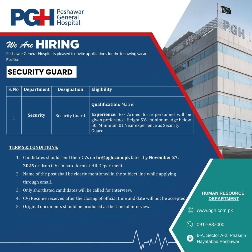 PGH Peshawar is hiring a Security Guard (Matric, Min 1 Yr Exp). Ex-Armed Force personnel and height 5’6″ min preferred. Apply by Nov 27, 2025.