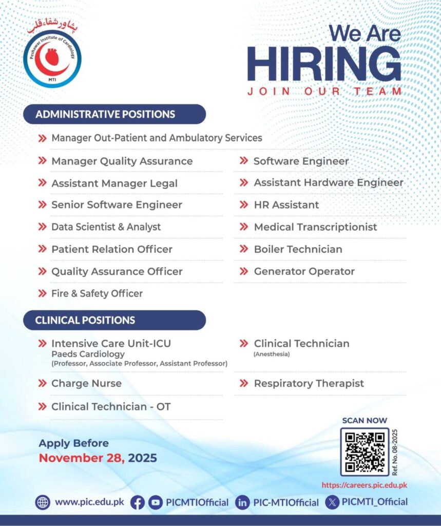 PIC MTI Peshawar is hiring for multiple Clinical (ICU, Nurse, Therapist) and Administrative (Manager, Engineer, HR) roles. Apply online via careers.pic.edu.pk by Nov 28, 2025.