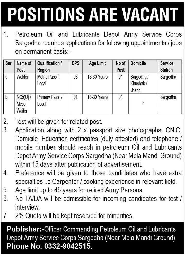 • How to Apply: Send your application along with 2 passport-size photographs, CNIC, educational certificates (attested), and your contact details to Petroleum Oil and Lubricants Depot Army Service Corps Sargodha (Near Mela Mandi Ground) within 15 days from the publication of this advertisement.