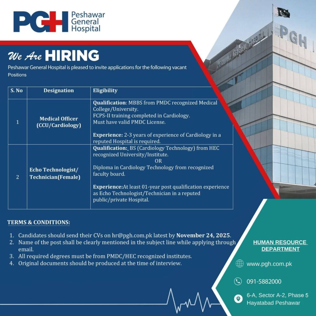Peshawar General Hospital (PGH) is hiring a Medical Officer (Cardiology) & Female Echo Technologist in Hayatabad, Peshawar. Apply by emailing your CV to hr@pgh.com.pk by Nov 24, 2025.