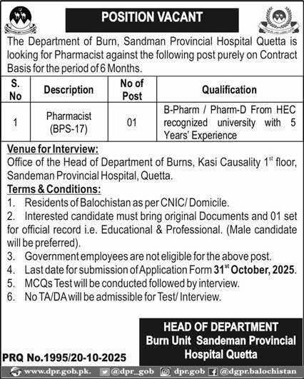 Apply for a Pharmacist position at Sandeman Provincial Hospital Quetta. The job is on a contract basis for 6 months. Candidates with B-Pharm/Pharm-D qualifications and 5 years of experience are invited to apply.
