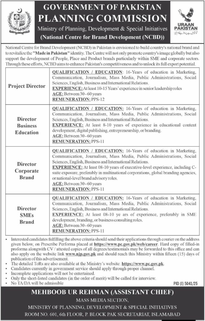 Apply for Planning Commission Pakistan jobs 2025 announced by National Centre for Brand Development (NCBD), Ministry of Planning, Development & Special Initiatives. Senior-level PPS vacancies open for Project Director and Directors in Business Education, Corporate Brand, and SMEs Branding. Apply online and by courier within 15 days.