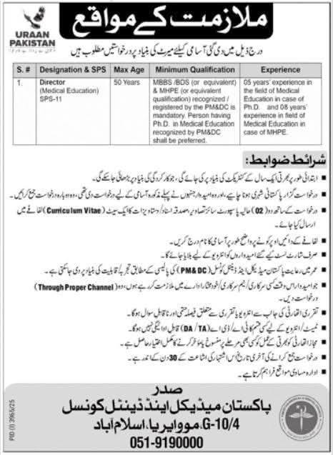 | 1 | Director (Medical Education) โ SPS-11 | 50 Years | MBBS/BDS (or equivalent) & MHPE (or equivalent qualification) recognized by PM&DC. Preference will be given to candidates holding a Ph.D. in Medical Education. | 03 years of experience in Medical Education (for MBBS/BDS + MHPE) or 08 years (for MBBS/BDS only). |