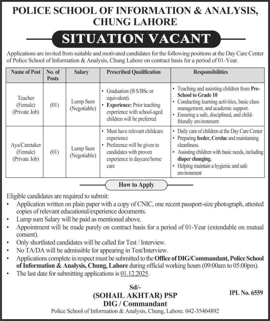 Police School Lahore seeks a Female Teacher (Graduation) and Aya/Caretaker for its Day Care Center on a 1-year contract. Apply by Dec 01, 2025.