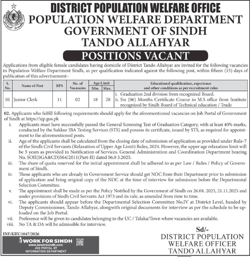 Population Welfare Department Sindh Tando Allahyar jobs 2026 for Junior Clerk BPS-11. Check eligibility criteria, age limit, vacancies, required qualifications and application process.