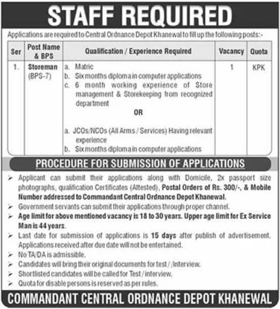“Apply now for a Storeman position at Central Ordnance Depot Khanewal (BPS-7) requiring Matric, a 6-month diploma in computer applications, and experience in store management. Vacancy available for KPK residents. Learn how to submit your application with required documents and age details.”