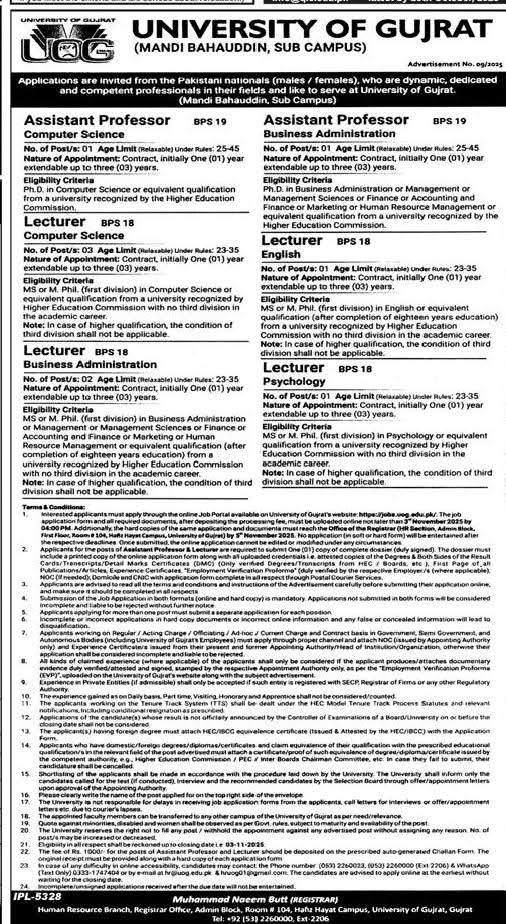 “University of Gujrat invites applications for Assistant Professor and Lecturer positions in Computer Science, Business Administration, English, and Psychology. Apply by 31st October 2025 for this excellent academic career opportunity.”