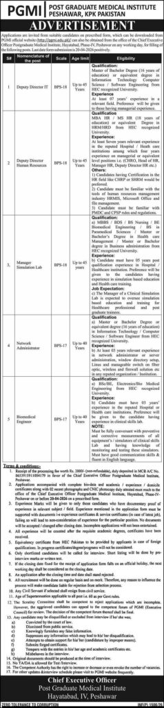 Apply for PGMII Peshawar jobs 2026. Vacancies for Deputy Director IT, HR, Network Administrator, Biomedical Engineer, and Manager Simulation Lab. Check eligibility, experience, fee, and deadline.