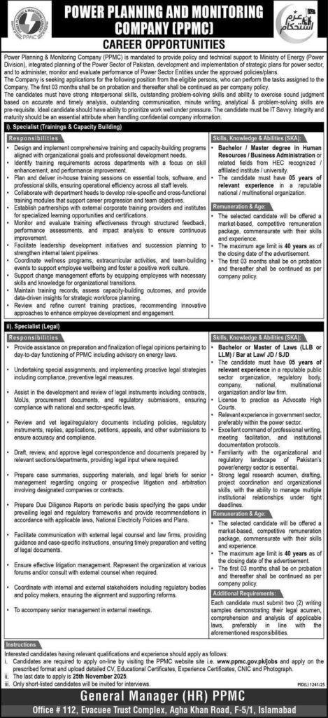 Power Planning & Monitoring Company (PPMC), Lahore invites applications for specialized jobs: Specialist (Legal) and Specialist (Trainings & Capacity Building). Required: LLB/LLM or MBA/BS HR with relevant experience in the power sector. Age limit 35/40. Apply online only at ppmc.gov.pk/jobs by 25 November 2025.