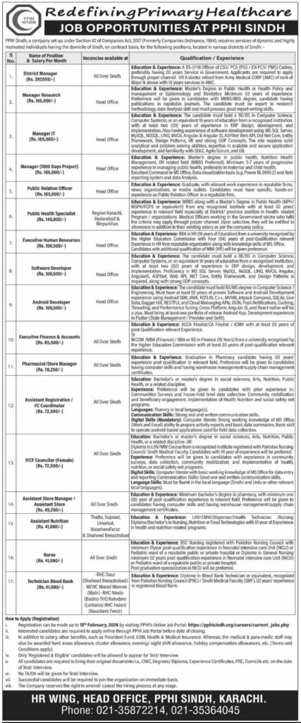 PPHI Sindh is hiring for various positions including District Manager, Manager Research, Software Developer, Public Health Specialist, and more. Apply by 15 February 2026.