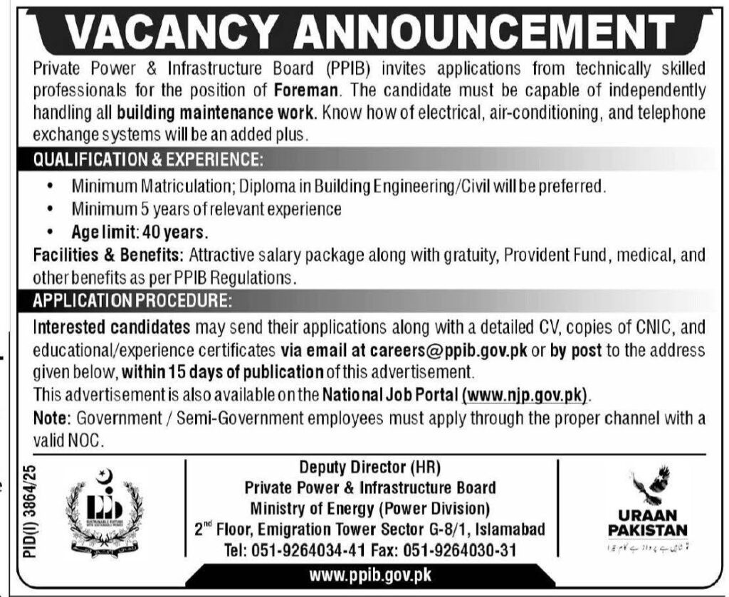 Private Power & Infrastructure Board (PPIB), Islamabad, Ministry of Energy, is hiring a Foreman for building maintenance. Required: Matriculation or DAE (Building Engineering/Civil) and 5 years relevant experience. Age limit 40. Apply via careers@ppib.gov.pk or by post within 15 days of the ad.