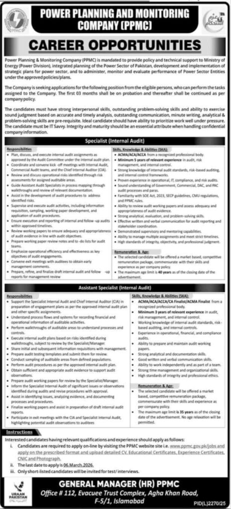 Apply for PPMC Jobs 2026 for Specialist Internal Audit and Assistant Specialist Internal Audit in Islamabad. Check CA/ACCA eligibility, experience requirements, age limit, and application deadline 06 March 2026.