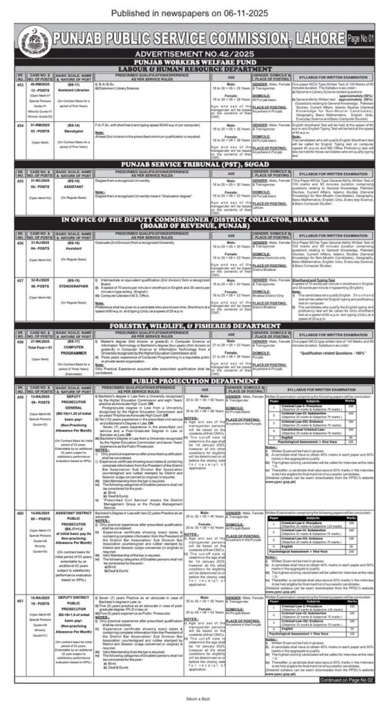 Punjab Public Service Commission (PPSC) Lahore has announced new jobs 2025 under Advertisement No. 42/2025. Multiple positions are available in Education, Health, Labour, Forestry, Revenue, and Prosecution Departments. Apply online before 21 November 2025 via www.ppsc.gop.pk.