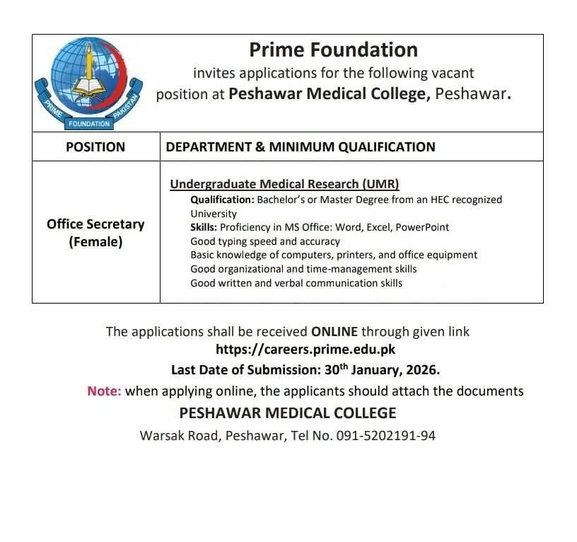 “Explore job opportunities at Prime Foundation, Peshawar Medical College. Apply for the position of Office Secretary (Female) in the Undergraduate Medical Research (UMR) department. Minimum qualifications: Bachelor’s/Master’s degree and proficiency in MS Office. Last date to apply: 30th January 2026.”