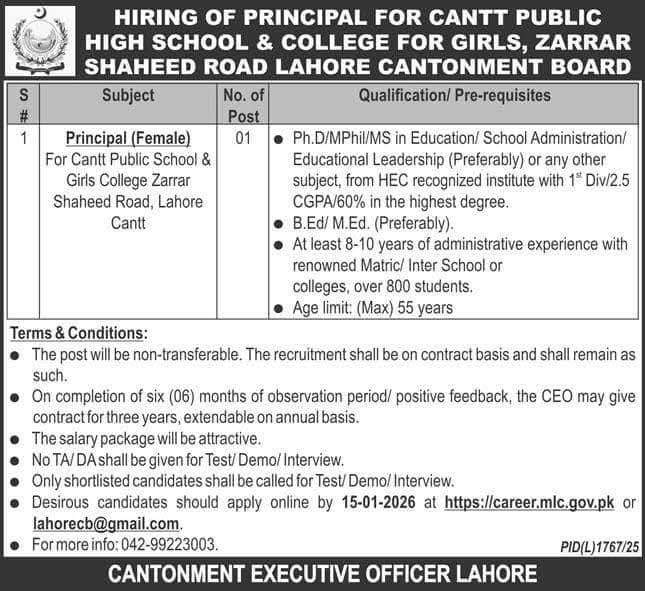 “Apply for the Principal (Female) position at Cantt Public School & Girls College, Zarrar Shaheed Road, Lahore Cantonment. Check the qualifications, experience requirements, and the application process for this prestigious role.”