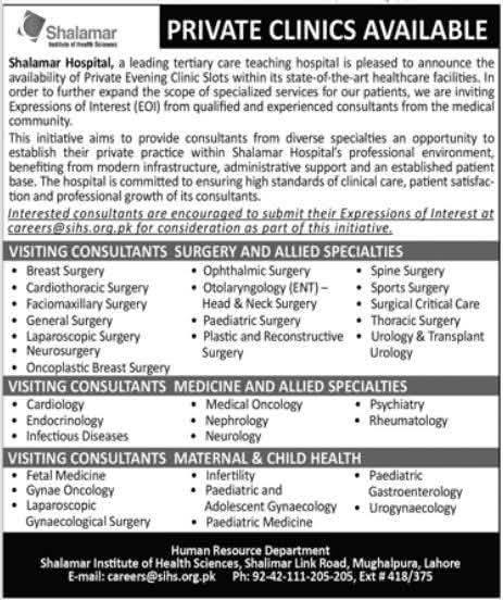 Explore visiting consultant opportunities at Shalamar Hospital, Lahore. Join a leading healthcare provider in various specialties including surgery, medicine, and maternal health. Apply now to establish your private practice in a state-of-the-art healthcare facility.