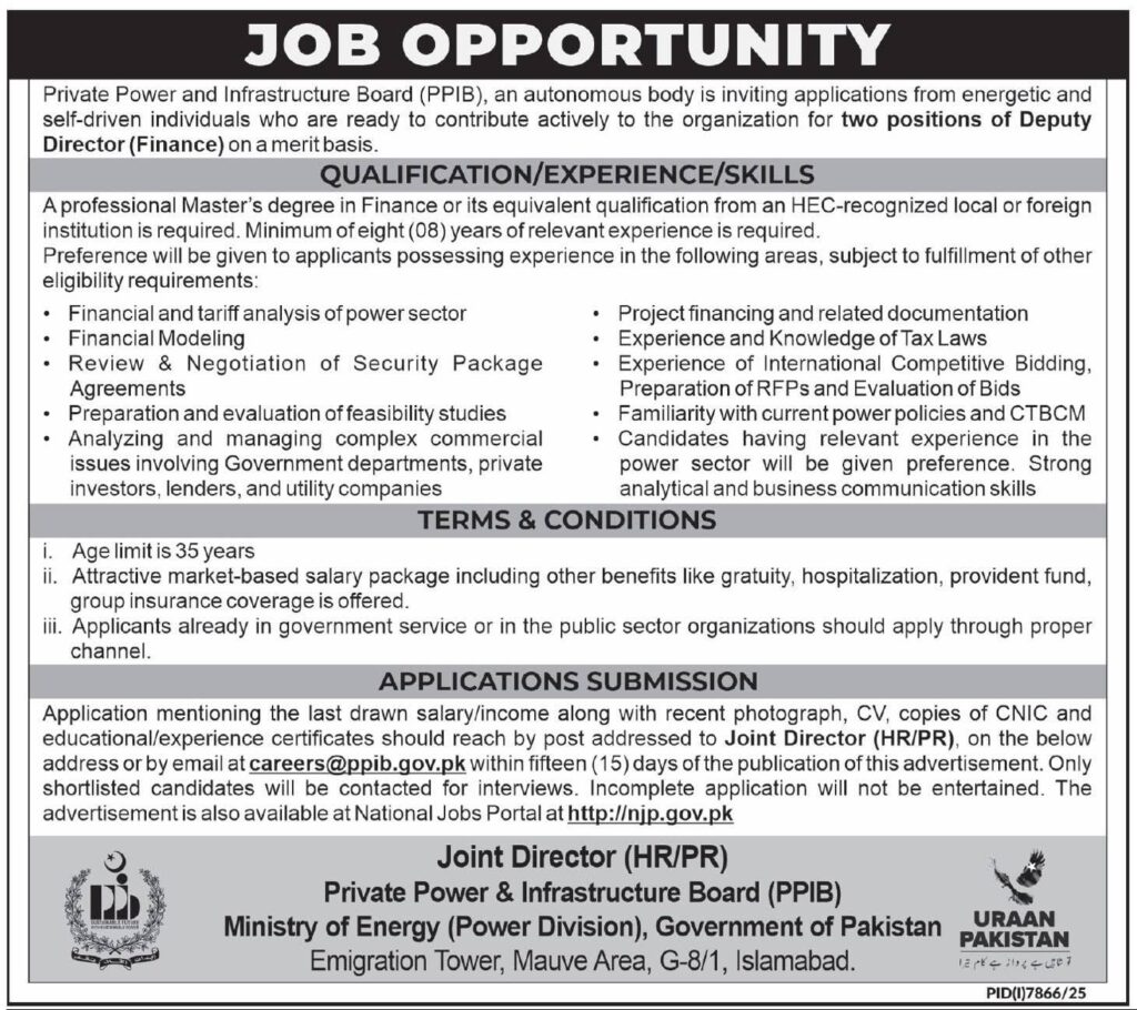 Deputy Director (Finance)Master’s degree in Finance or equivalent from HEC-recognized institutionMinimum 8 years relevant experience in finance, preferably in power sector02