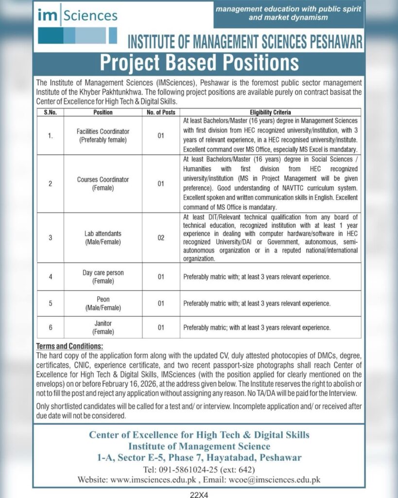 Explore project-based job opportunities at the Institute of Management Sciences (IMSciences) Peshawar. Positions available in facilities coordination, courses coordination, lab assistance, and more. Apply by February 16, 2026. Check eligibility criteria and detailed requirements below.