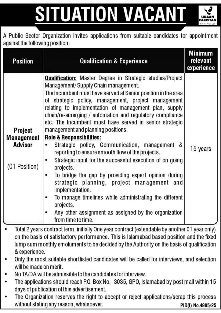 Apply for the position of Project Management Advisor at a Public Sector Organization. Candidates with a Master’s degree in Strategic Studies, Project Management, or Supply Chain Management and 15 years of experience are encouraged to apply. This Islamabad-based role offers a one-year contract, extendable based on performance.
