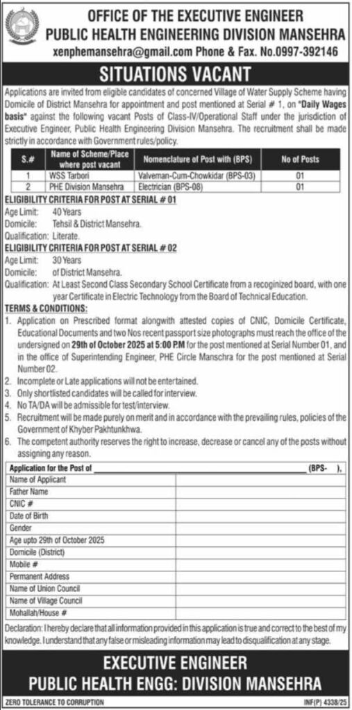 “Apply for Class-IV Operational Staff vacancies in Public Health Engineering Division Mansehra. Positions available for Valveman-Cum-Chowkidar and Electrician. Daily wages, with clear eligibility criteria for District Mansehra residents. Apply before 29th October 2025.”