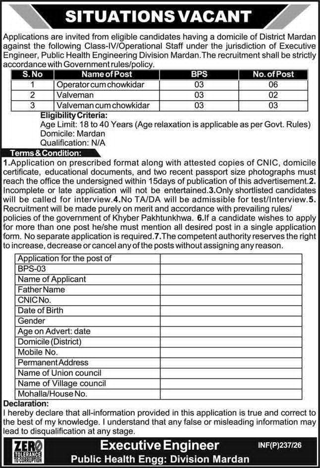 Apply for Public Health Engineering Division Mardan jobs 2026. Latest Class-IV vacancies including Operator cum Chowkidar and Valveman with eligibility criteria, posts, and application process.