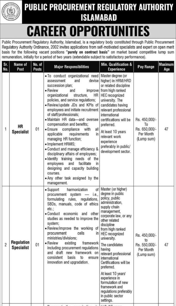“Explore exciting career opportunities at the Public Procurement Regulatory Authority (PPRP) Islamabad. Apply for top roles such as HR Specialist, Litigation Specialist, and Legal Expert. Attractive salaries, growth prospects, and government positions await. Apply now before the deadline, October 27, 2025.”