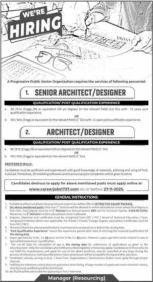 Progressive Public Sector Jobs! Hiring Senior Architect/Designer (13+ yrs exp) & Architect/Designer. Engineering qualifications required. Apply online via careerjobs1737.com by 27th Nov 2025.