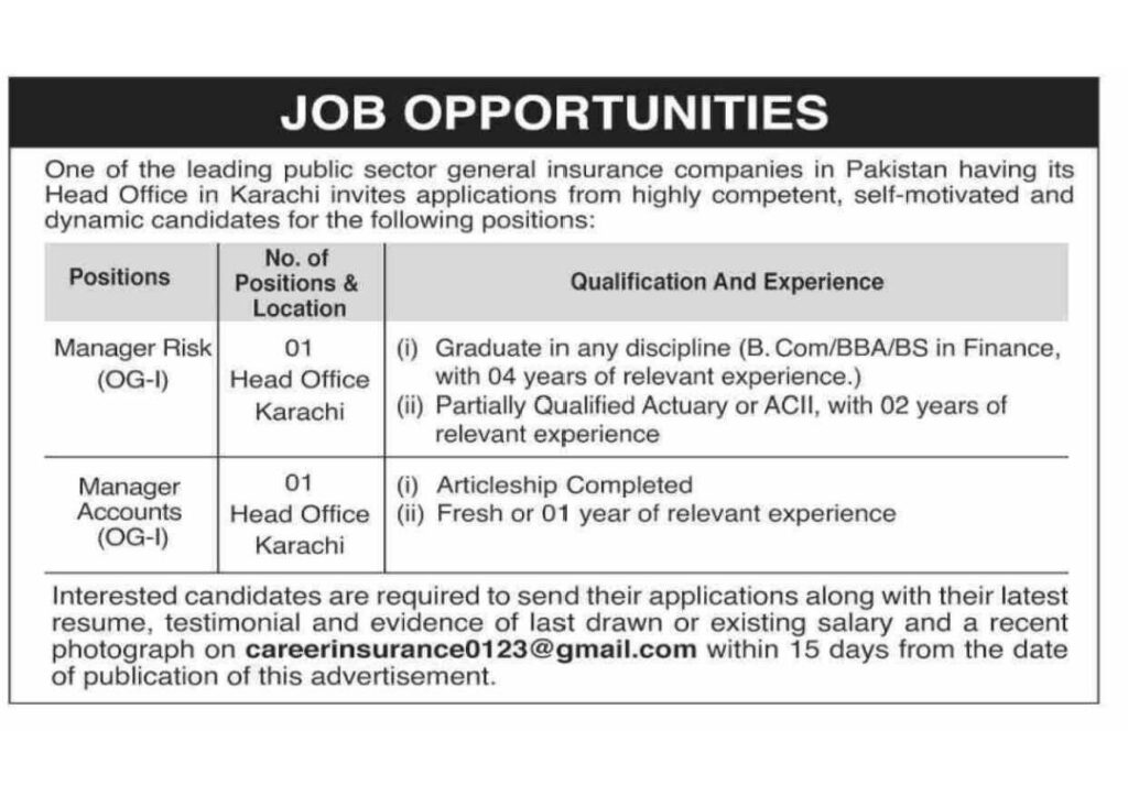 Explore job opportunities at one of the leading public sector insurance companies in Karachi. We’re hiring for Manager Risk and Manager Accounts positions. Apply now with your resume, qualifications, and experience to join a dynamic team.