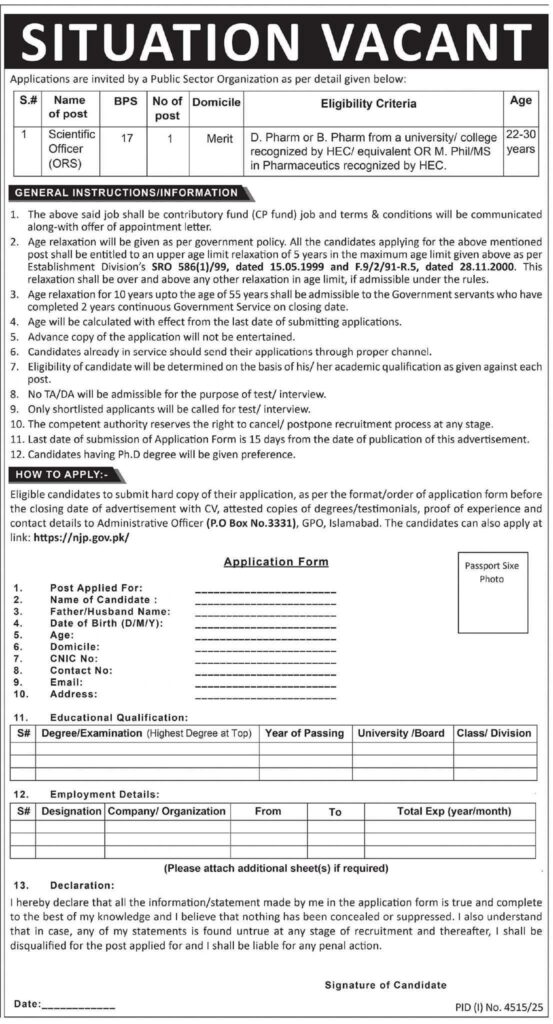 “Apply for the Scientific Officer position (BPS 17) in a public sector organization. The position requires a D. Pharm or B. Pharm degree with an age limit of 22-30 years. Submit your application by the deadline for a chance to work with a leading government organization.”