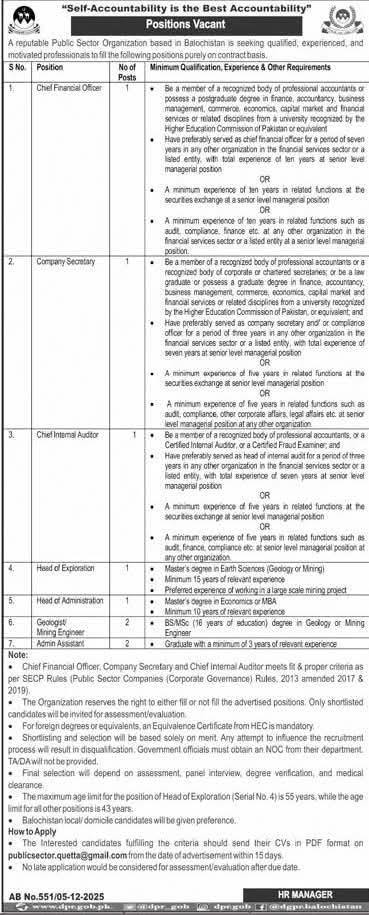| 1 | Chief Financial Officer | Postgraduate degree in finance, accounting, or related field | 10+ years in financial management or senior managerial roles | Balochistan |