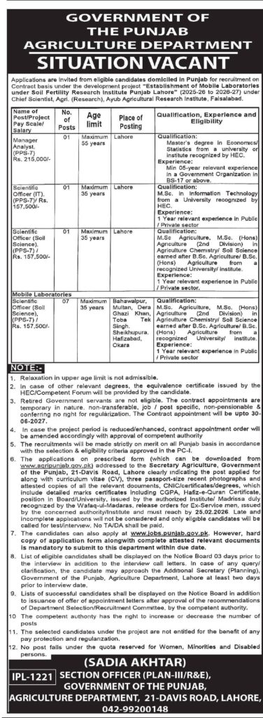 Punjab Agriculture Department Jobs 2026 – Manager Analyst & Scientific Officer Vacancies (Lahore & Mobile Labs)