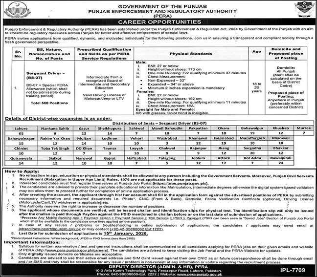Punjab Enforcement and Regulatory Authority announces PERA jobs 2025 for Sergeant Driver BS-07 on contract basis across Punjab districts. Check eligibility, physical standards, age limit, and vacancy distribution.