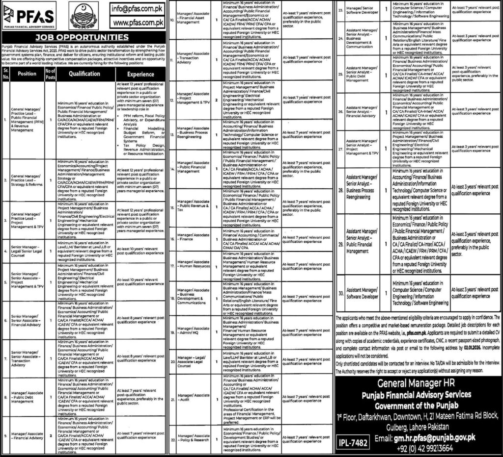 Apply for Punjab Financial Advisory Services (PFAS) jobs 2025 in Lahore. Government of Punjab announces multiple managerial and associate-level vacancies in public financial management, policy, taxation, audit, software development, and business process reengineering. Competitive packages, apply before deadline.