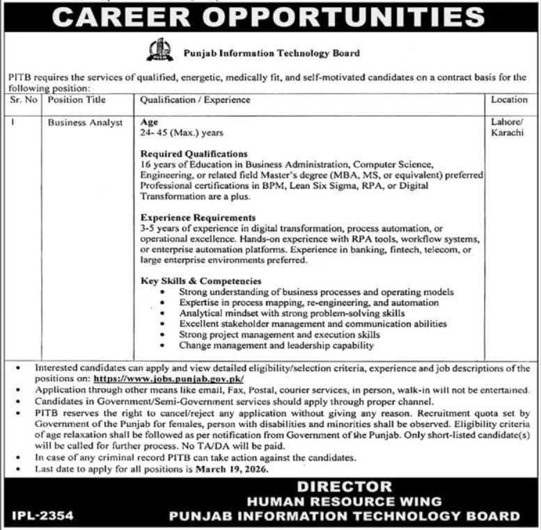 Punjab Information Technology Board (PITB) is hiring a Business Analyst on a contract basis for Lahore and Karachi offices. Candidates with 16 years of education in business administration, computer science, or engineering and relevant experience can apply before 19 March 2026.