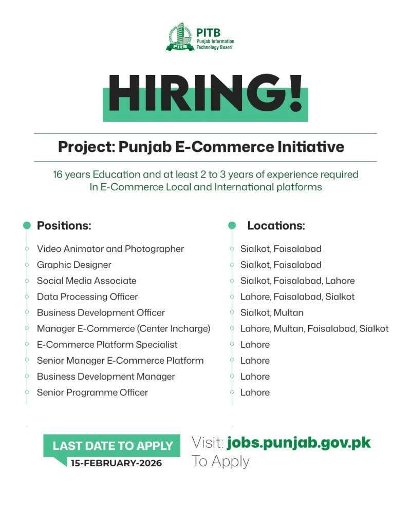 Punjab Information Technology Board (PITB) is recruiting qualified professionals for its Punjab E-Commerce Initiative. Candidates must have 16 years of education and 2–3 years of relevant experience in local and international e-commerce platforms.