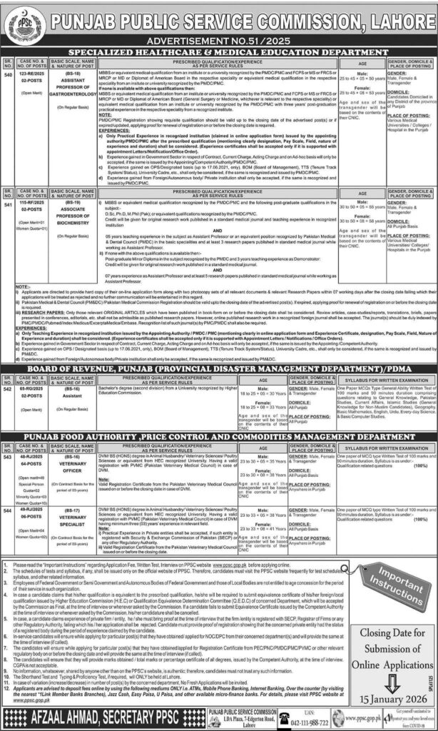 “Apply for various medical and veterinary positions through Punjab Public Service Commission (PPSC) Advertisement No. 51/2025. Available roles include Assistant Professor in Gastroenterology, Biochemistry, and Veterinary Officer, with specific qualifications and age limits.”