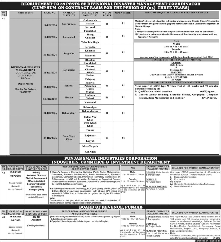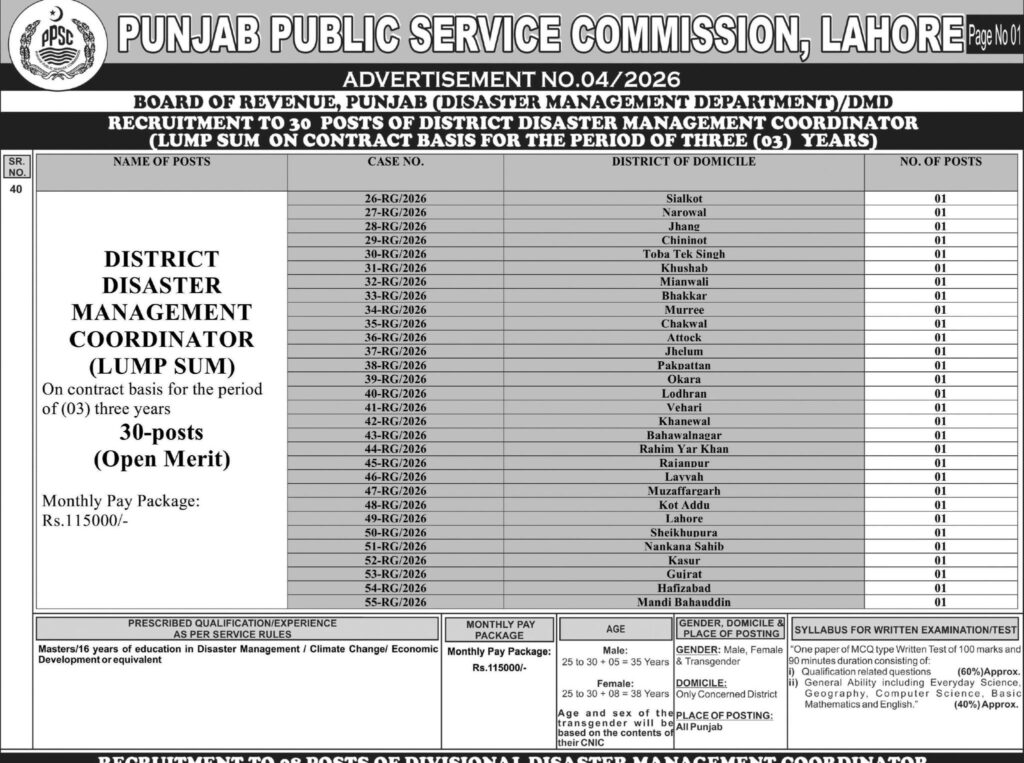 Apply for PPSC Jobs 2026 under the Punjab Disaster Management Department. 30+ vacancies for District Disaster Management Coordinator, Assistant Director, and other positions. Register by 16 March 2026.