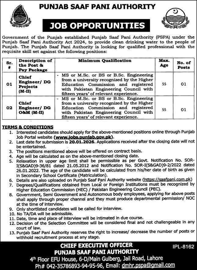 “Punjab Saaf Pani Authority (PSPA) is hiring for Chief Engineer positions in DG Projects and O&M. Candidates with an MS/M.Sc. or BS/B.Sc. in Engineering and 15 years of experience are encouraged to apply. Last date for submission: 20th January 2026.”