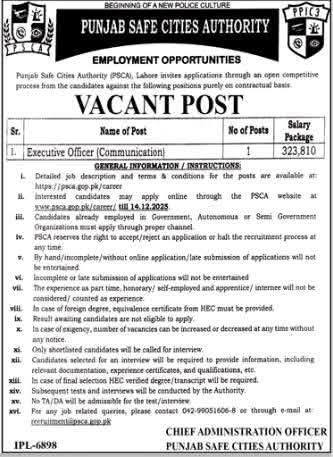 “Apply for the Executive Officer (Communication) position at Punjab Safe Cities Authority (PSCA). Learn about qualifications, salary package, and application process for this role. Apply online by 12th December 2025.”