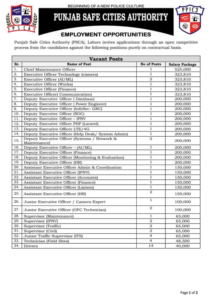 Punjab Safe Cities Authority (PSCA) Jobs 2026 announced for Executive Officers, Assistant Executive Officers, Supervisors, and Technicians. Check salary packages, qualifications, experience, and application deadline 12 March 2026.