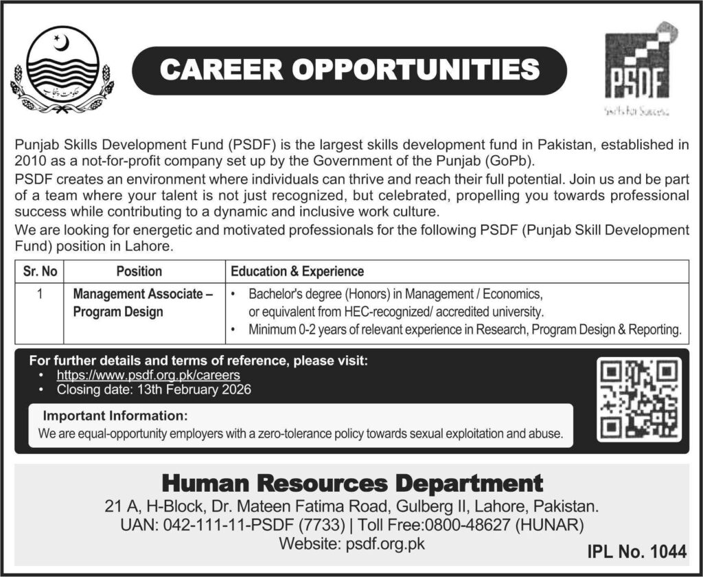 Punjab Skills Development Fund (PSDF) invites applications for the Management Associate position in Program Design. Apply by February 13, 2026.