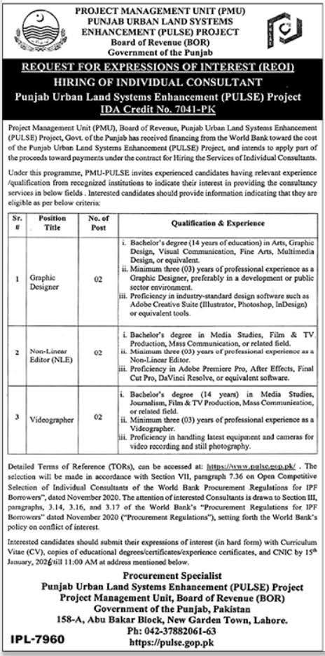 Punjab Urban Land Systems Enhancement Project PULSE Jobs 2026 announced for individual consultants including Graphic Designer, Non Linear Editor and Videographer. Government of Punjab project offering professional consultancy opportunities.