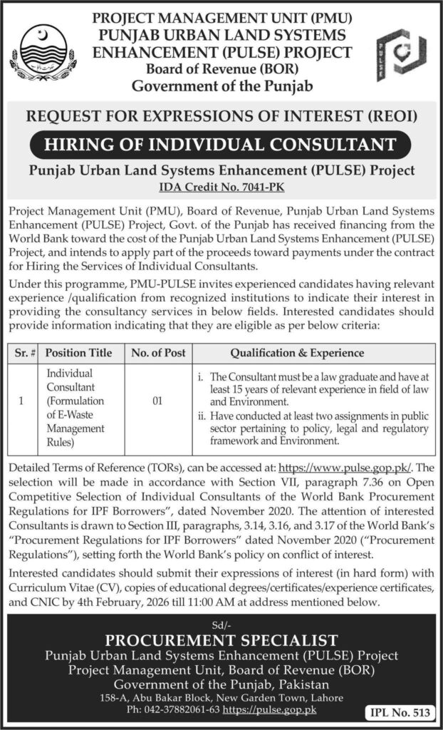 The Project Management Unit (PMU), Punjab Urban Land Systems Enhancement (PULSE) Project, under the Board of Revenue (BOR), Government of the Punjab, invites Expressions of Interest for hiring an Individual Consultant. The project is funded through international financing and seeks highly experienced professionals for specialized consultancy services.