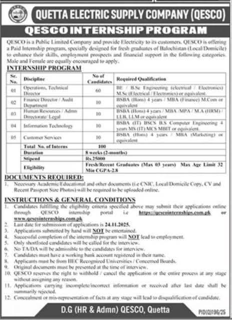 Apply for the QUESCO Paid Internship Program 2025 in Quetta! Offering 100 paid internships for fresh graduates of Balochistan in Electrical Engineering, Finance, HR, IT, and Law. Earn a Rs. 25,000 stipend for 8 weeks. Max Age Limit 32. Apply online at https://www.google.com/search?q=QescoInternships.com.pk by November 24, 2025.