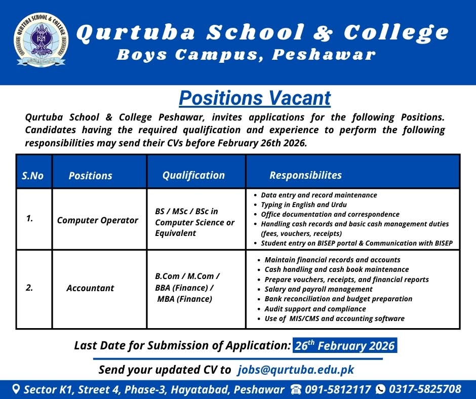 Apply for Qurtuba School & College Peshawar Jobs 2026 for Computer Operator and Accountant positions. BSc in Computer Science or B.Com required. Deadline to apply is 26th February 2026.