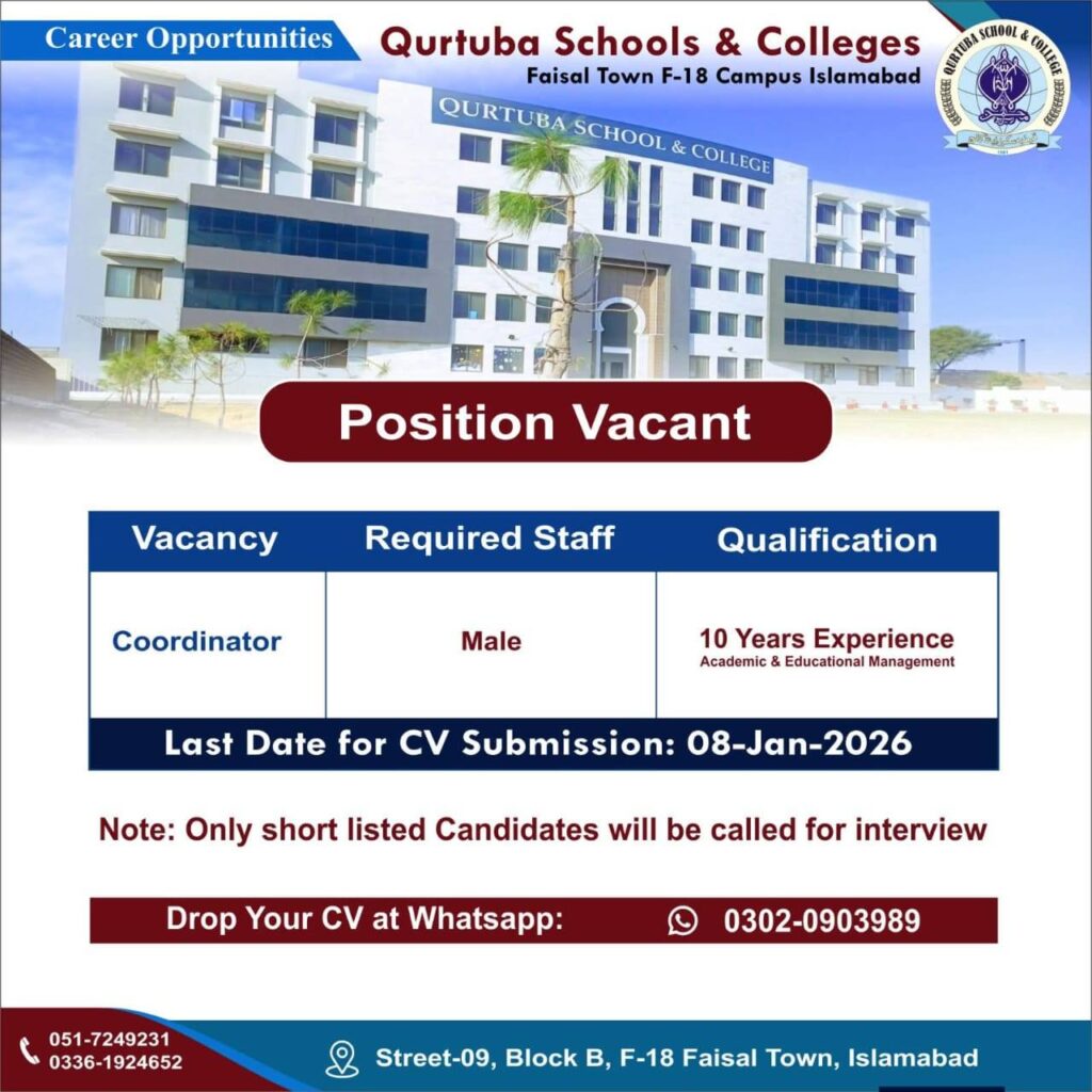 Apply for Qurtuba Schools & Colleges Islamabad Jobs 2026. Latest vacancy for Coordinator position at Faisal Town F-18 Campus. Candidates with strong academic and educational management experience are encouraged to apply before the deadline.