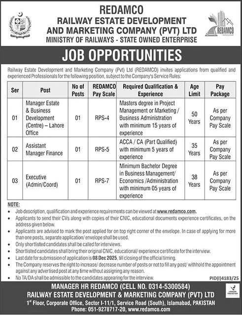 REDAMCO (Ministry of Railways) is hiring Manager Estate (Lahore), Assistant Manager Finance, and Executive. Min 5-15 years experience required. Apply by Dec 08, 2025.