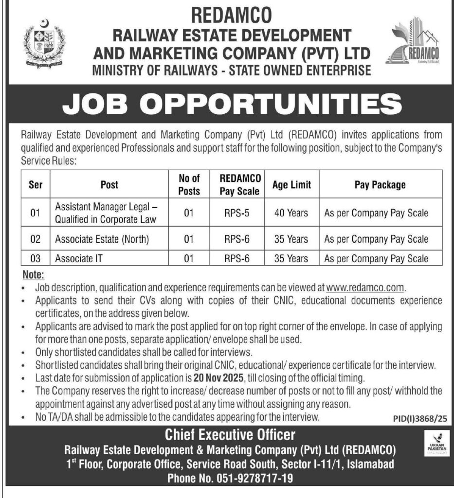 Railway Estate Development and Marketing Company (REDAMCO), Islamabad, invites applications for Assistant Manager Legal (Corporate Law), Associate Estate (North), and Associate IT. Vacancies are for qualified professionals to join the Ministry of Railways. Last date for submission is 20 November 2025. Apply by sending CVs.