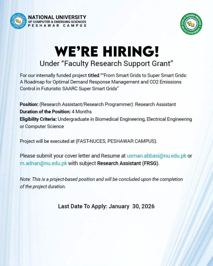 Explore a research assistant role under the Faculty Research Support Grant at NUCES Peshawar Campus. This 4-month project-based position requires candidates with an undergraduate degree in Biomedical Engineering, Electrical Engineering, or Computer Science. The project focuses on optimizing demand response management and CO2 emissions control in SAARC super smart grids. Apply by January 30, 2026.